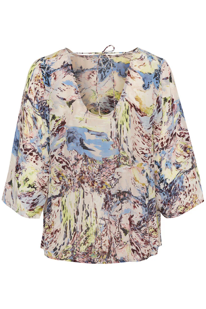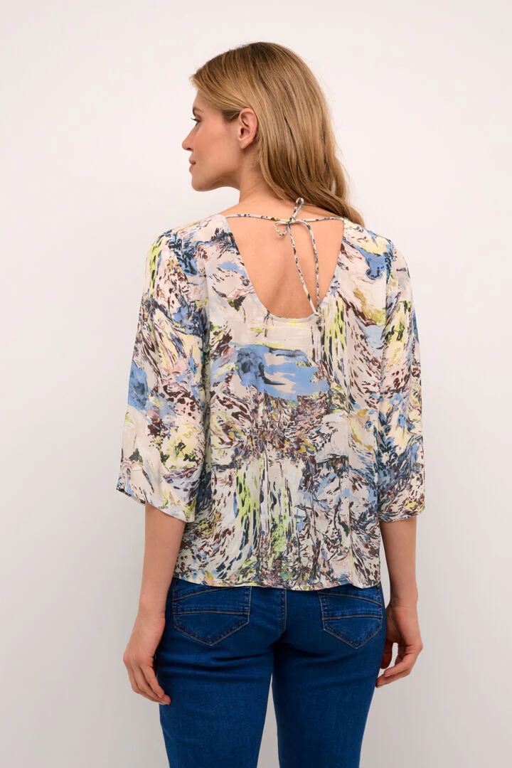 Conçue pour celles qui apprécient l’élégance artistique et la fluidité intemporelle, cette blouse est une célébration de la couleur, de la lumière et de l’émotion capturée sur toile. Les tons de bleu, crème, vert et brun se mélangent pour créer un véritable tableau d’art vivant.