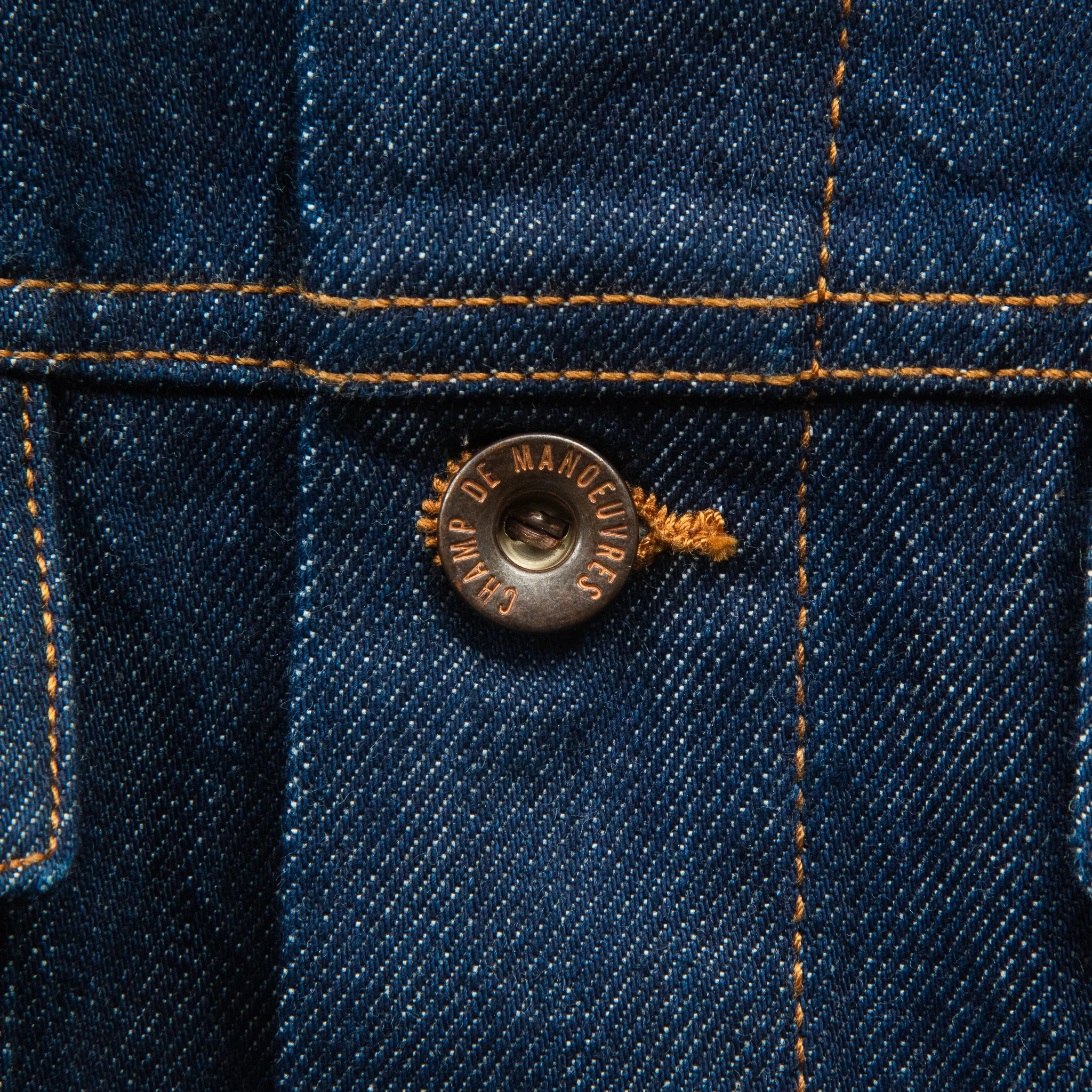 C’est dans les détails que ce blouson se distingue avec un clin d’œil subtil à l’héritage du Denim. Deux poches poitrine, fermées par des rivets métalliques gravés en creux du nom de notre marque « Champ de Manœuvre », dans une élégante teinte bronze, s’inscrivent dans la tradition du jean.