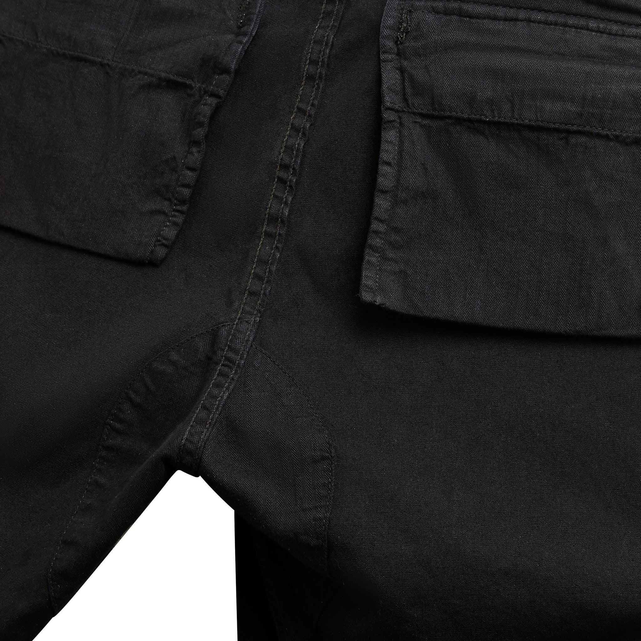 Il y a trois différents types de boutonnage pour le BDU: le scratch, qui est la finition la moins onéreuse ; le bouton-pression métallique ; les boutons quatre trous cousus, que l’on peut retrouver dans plusieurs gardes robes militaires. Dans certaines versions, on peut uniquement constater un point d’arrêt sur les deux extrémités, ce qui est plus économique. Notre pantalon, outre son boutonnage en corozo gardant le volume soufflé comme une vraie poche militaire, possède encore une double patte permettant de cacher le bouton, et ainsi de faciliter le déboutonnage de la poche côté cuisses et dos. Sur la jambe gauche, on a placé une petite poche pour y glisser votre smartphone ou plus si affinités.
