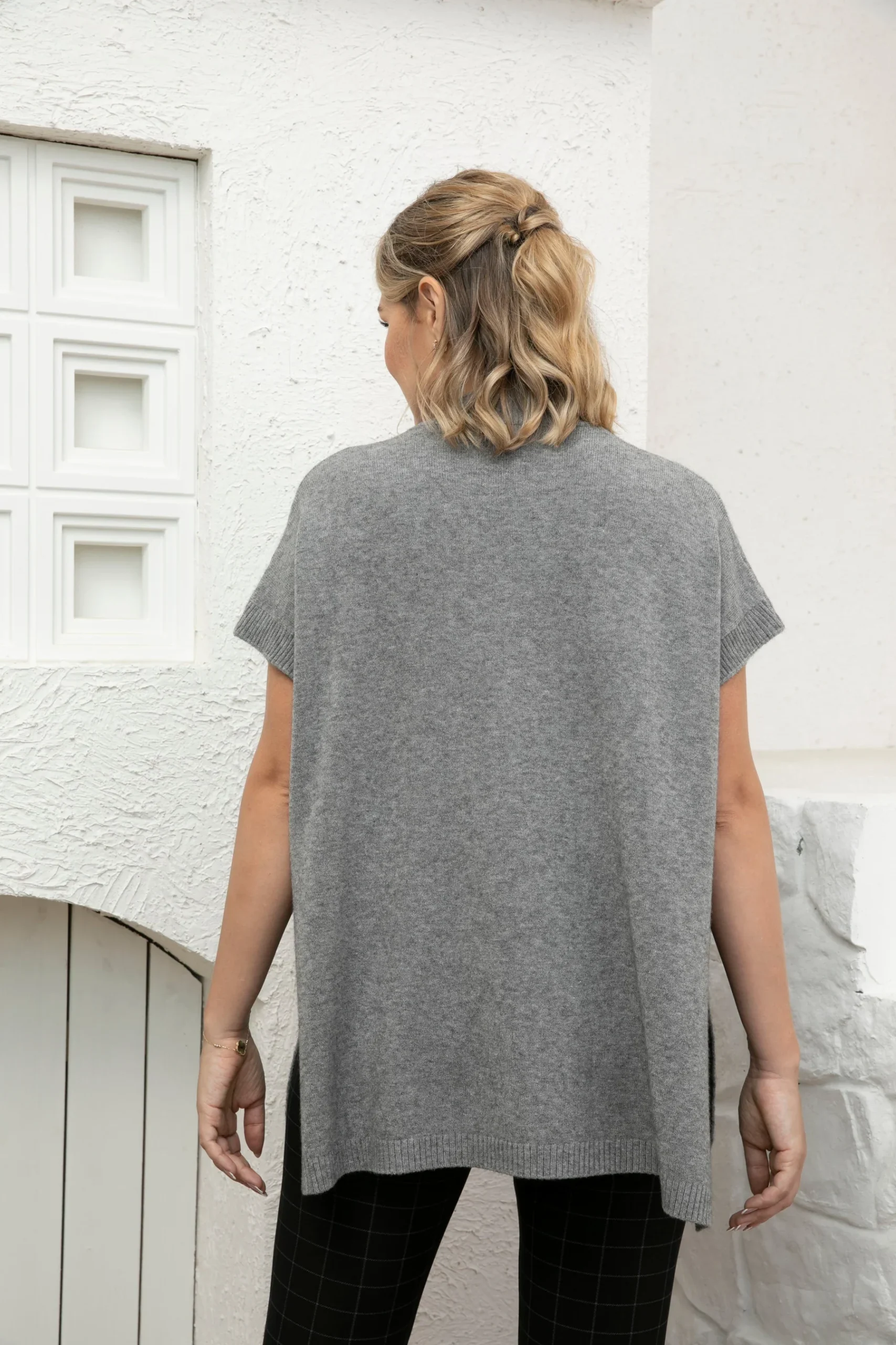 Ce chandail à manches courtes et encolure en V est facile à porter et polyvalent. Ses longues fentes latérales et son détail côtelé à l’avant ajoutent du style tout en permettant de superposer un haut à manches longues pour plus de confort. Une pièce pratique et moderne pour compléter vos tenues.