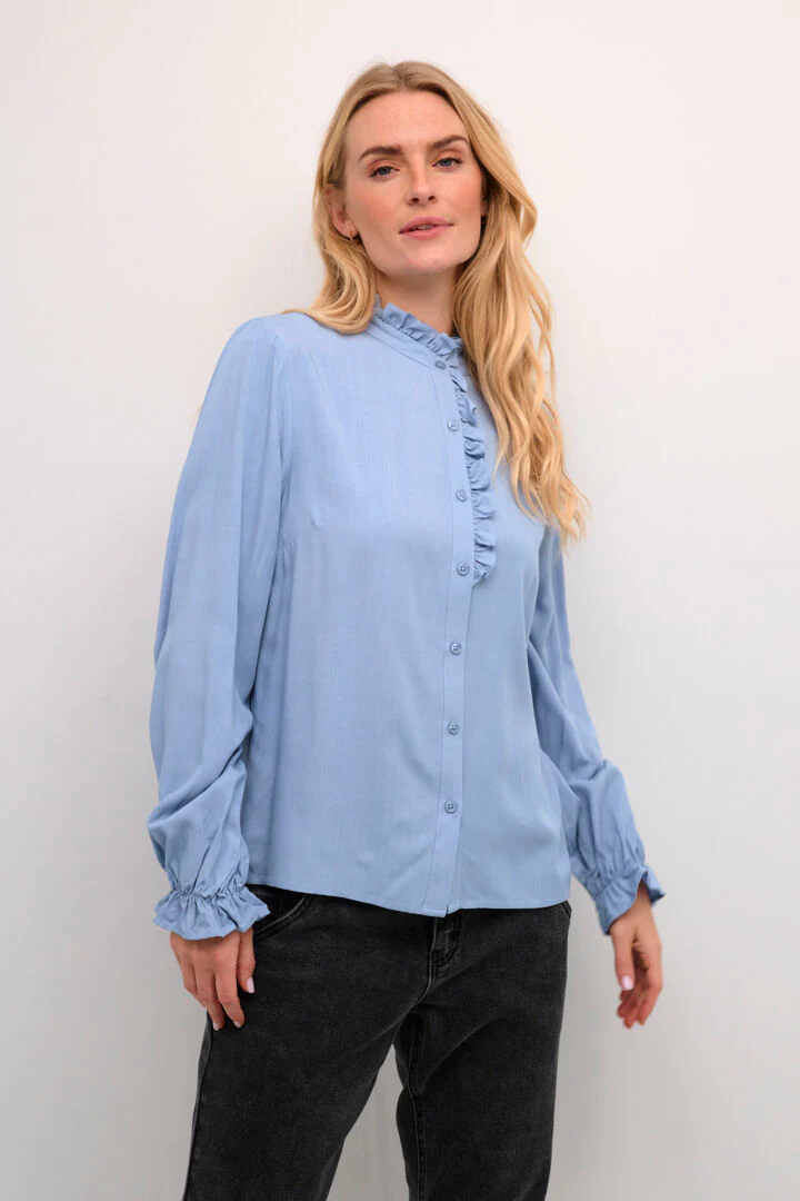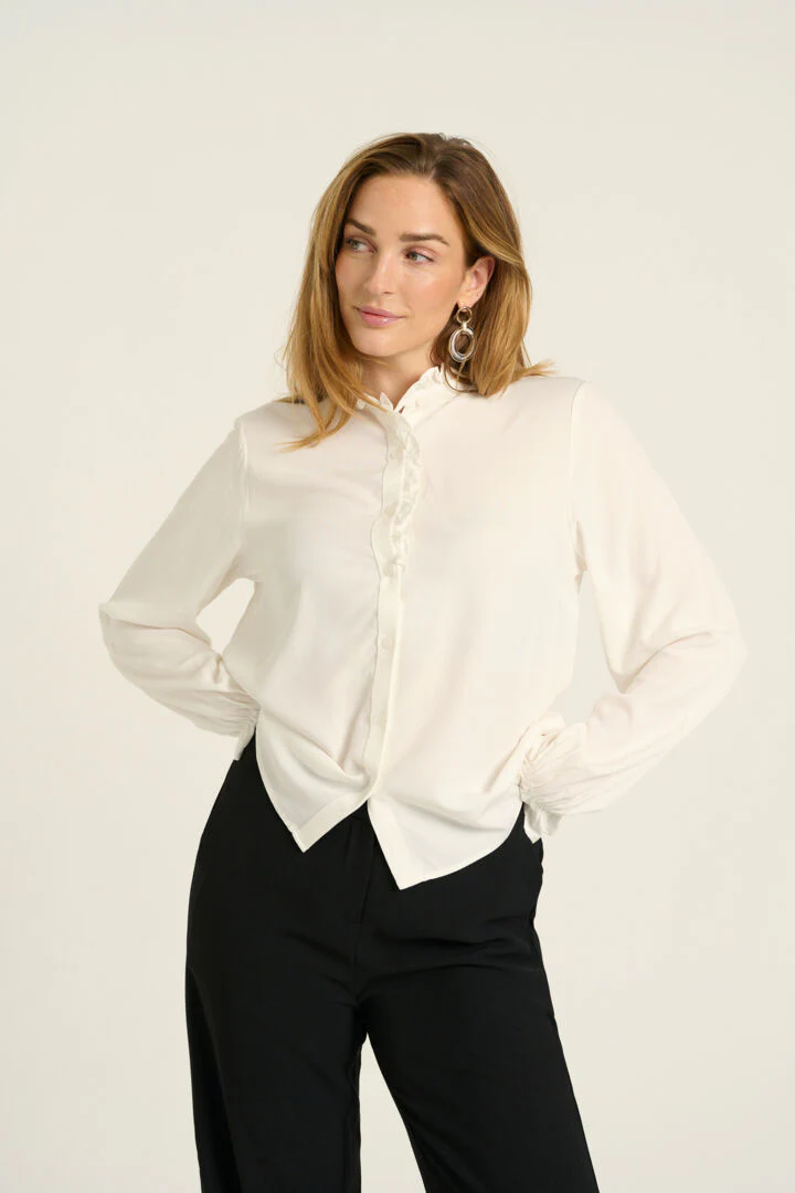 La chemise à col mao est une pièce qui offre une alternative rafraîchissante au col traditionnel. Le col mao est caractérisé par son absence de revers et de boutonnières, ce qui crée une ligne épurée et moderne au niveau du cou. Malgré sa simplicité apparente, cette chemise se pare de volants sur le col et aux poignets, la rendant des plus uniques.
