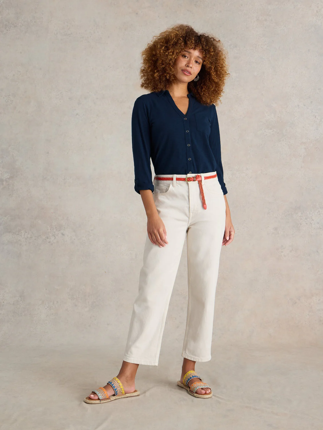 - Le modèle porte une taille 10 et mesure 1,77 m (5’9.5″)