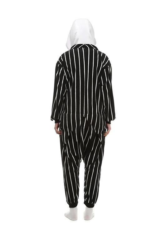 Ce pyjama est équipé d’une capuche illustrant le visage effrayant de Jack Skellington, suivie de longues rayures blanches sur un fond noir pour illustrer parfaitement le personnage et augmenter le côté funeste de la tenue.