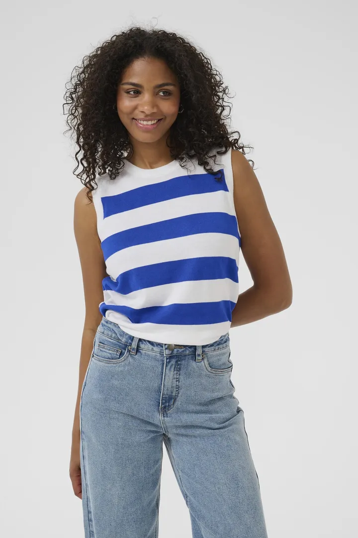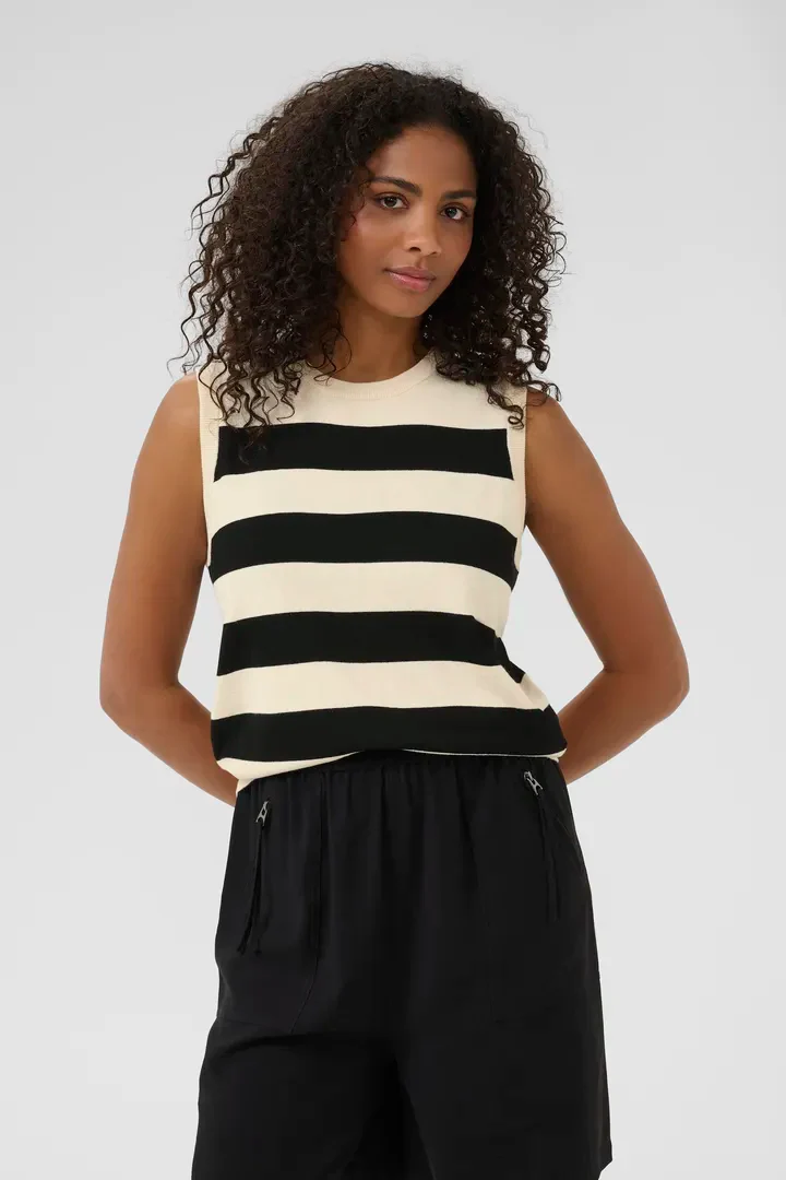 Avec ses rayures franches qui tracent le rythme, cette camisole n’a pas peur de se faire remarquer. Chaque ligne, chaque contraste, semble dessiner une énergie nouvelle sur le corps, comme un manifeste de style à enfiler. Tricoté dans une maille douce et confortable, il allie tempérament visuel et facilité au quotidien. Il insuffle un vent de modernité graphique à vos tenues. Un morceau qui a du cran, et qu’on aime pour ça.