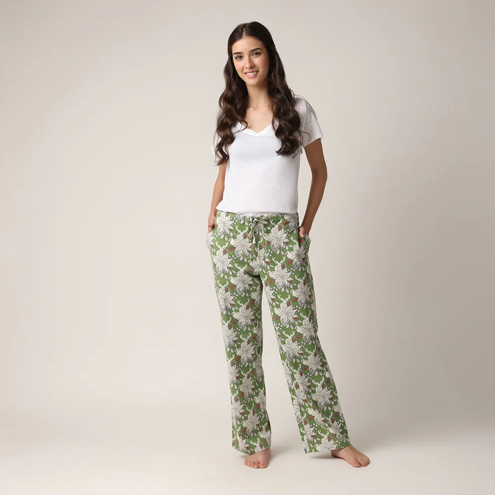 Pantalon de pyjama chaud et confortable en flanelle épaisse. Le tissu est décoré de cerfs, de poinsettias enneigés, de baies rouges. Idéal pour rester au chaud pendant les journées froides et facile à assortir avec un haut de pyjama. Vendu dans un petit sac assorti, il est idéal pour offrir ou emporter en voyage.