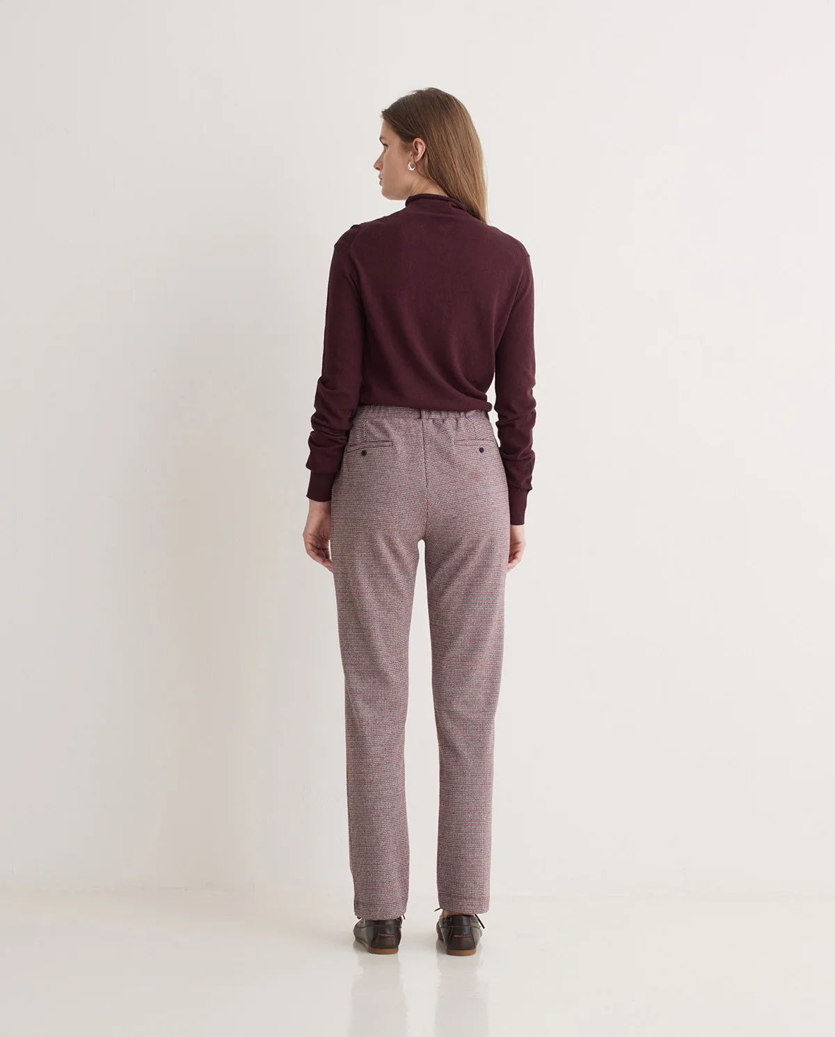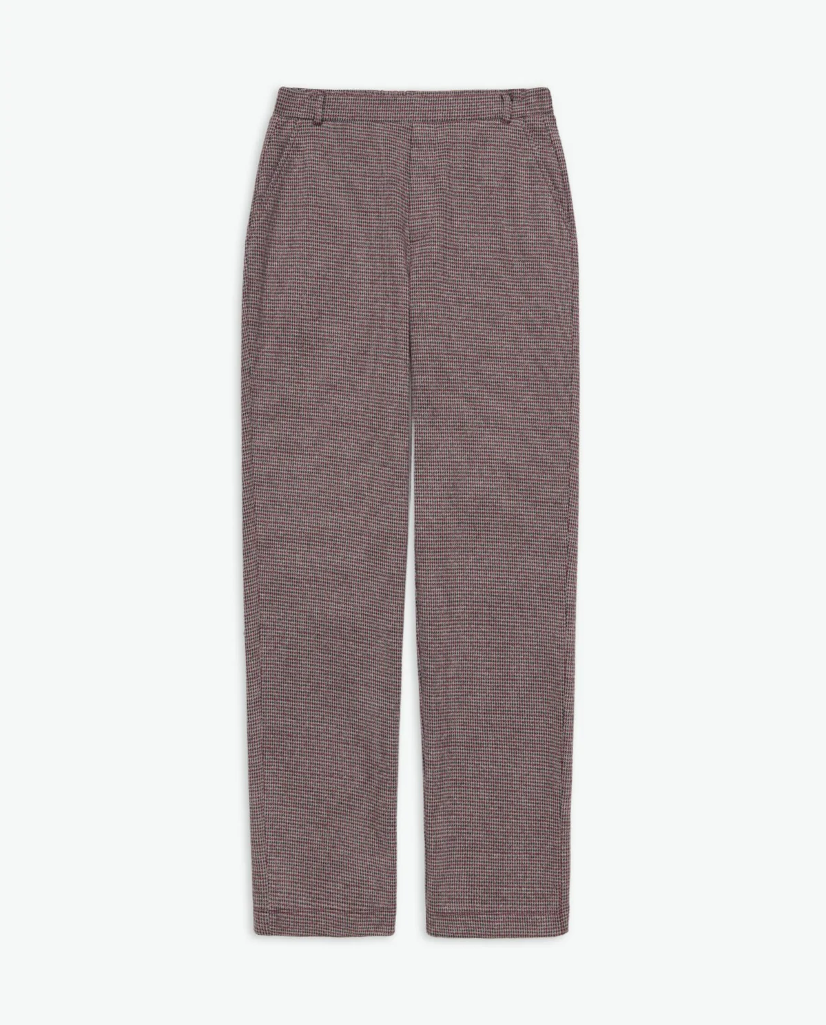 Ce pantalon droit à imprimé pied-de-poule revisite un motif classique dans une teinte bordeaux profonde et raffinée. Sa taille mi-haute élastiquée assure un confort optimal, tandis que sa coupe droite et fluide allonge la silhouette. Parfait pour composer un look chic et moderne, il se porte aussi bien avec des bottines que des chaussures plates.