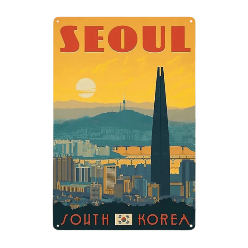 Cette Plaque Metal Seoul South Korea de style vintage plaira certainement à tous les collectionneurs. Cette plaque est parfaite pour décorer votre maison ou votre bureau. Avec son aspect vintage, qui rappelle les vieilles publicités, son aspect jauni et ses bords rouillés, c’est une pièce unique que vous voudrez absolument posséder.