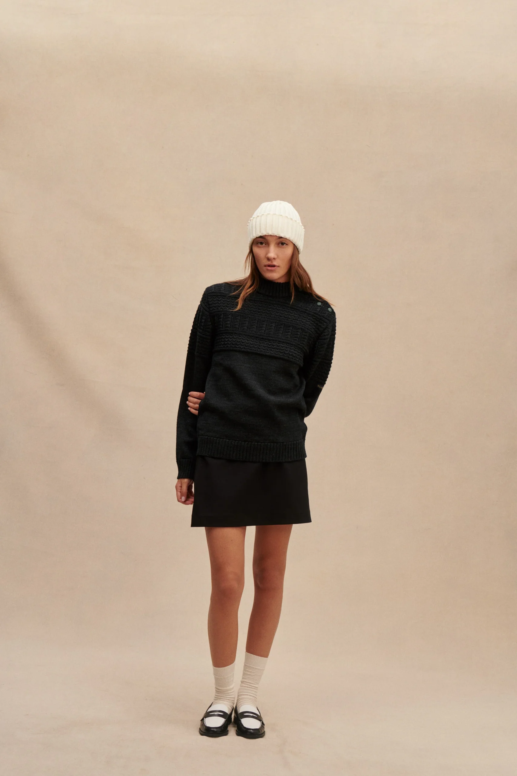 Avec son gris profond et intemporel, ce pull marin pêcheur s’associe facilement à un jean, un pantalon en laine ou un pantalon de travail chic, offrant un style à la fois authentique, résolument moderne et fémininement robuste. Une pièce idéale pour celles qui veulent porter un héritage marin avec style et personnalité.