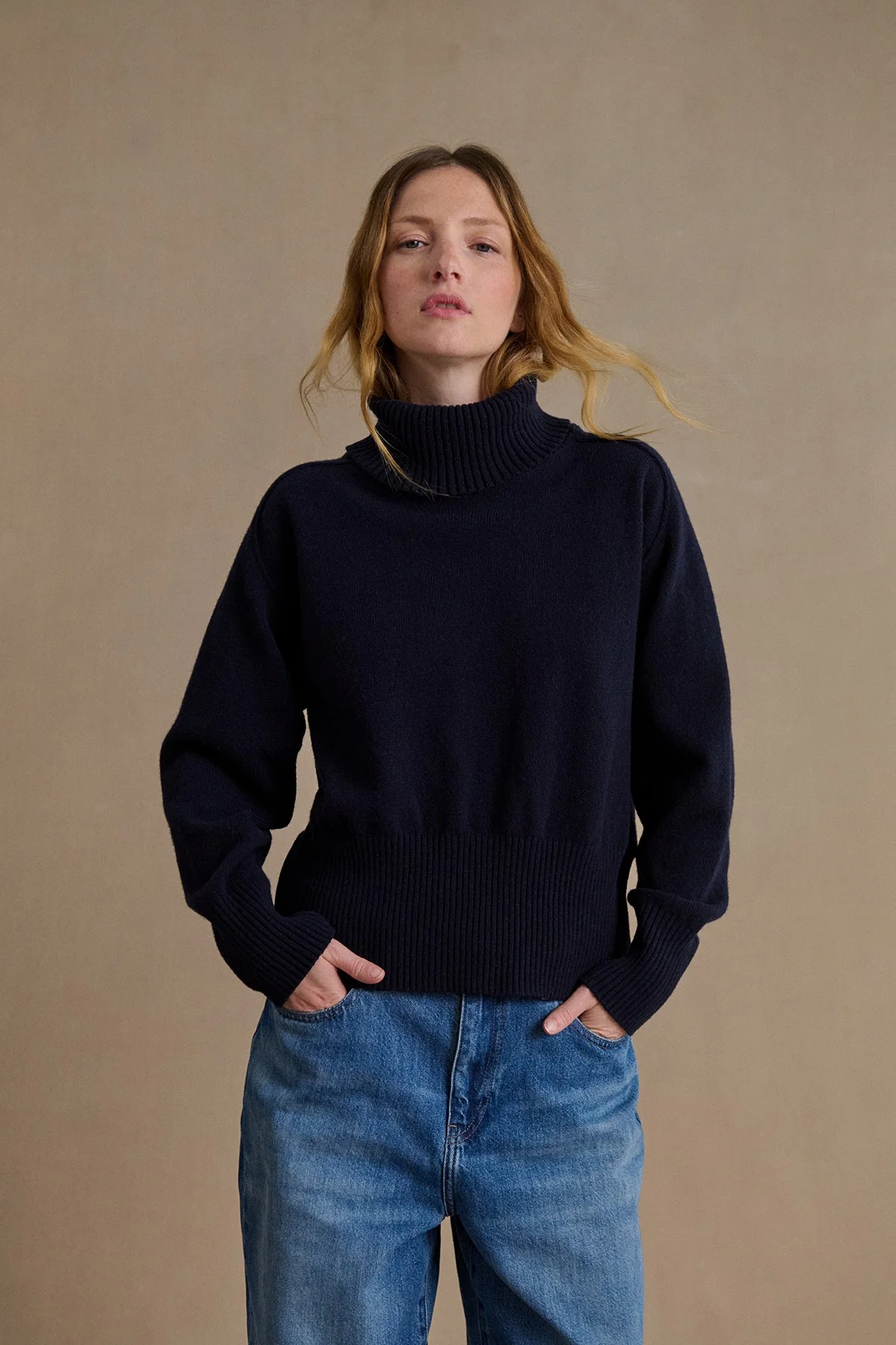 Sa coupe très ajustée, près du corps et légèrement longue, structure la silhouette avec élégance. Ce choix de coupe met en valeur la ligne masculine tout en offrant une allure soignée, parfaite aussi bien pour un usage casual chic que pour des tenues plus habillées. Le pull marin Le Minor se distingue ainsi par son équilibre subtil entre tradition et modernité.