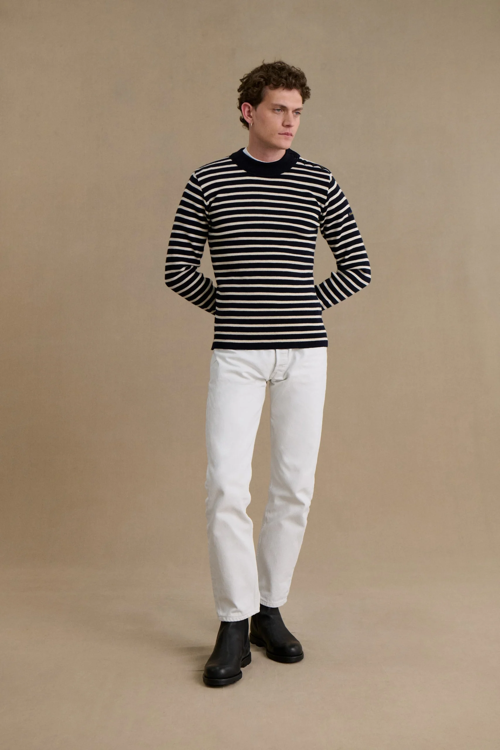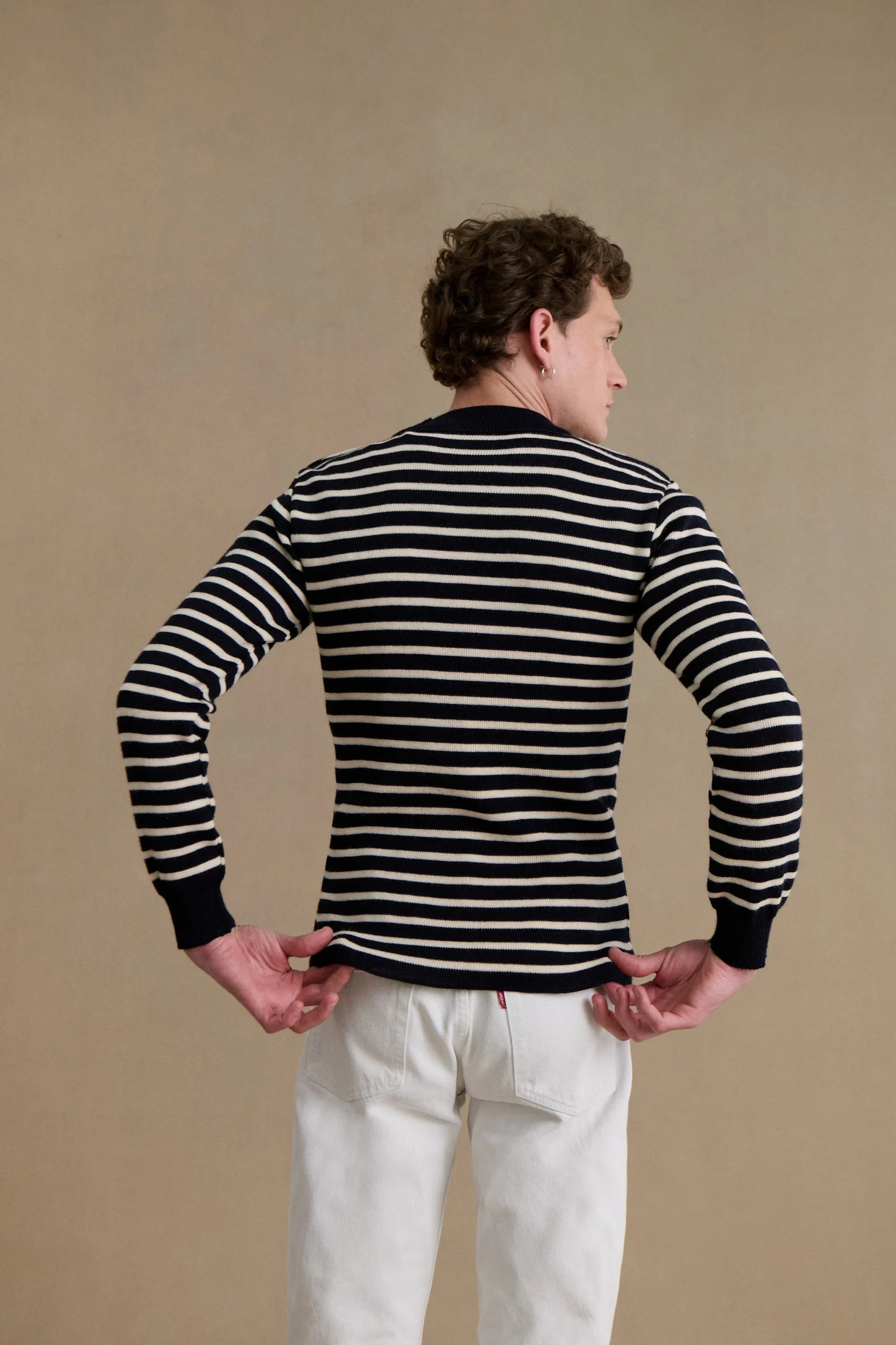 Son jeu de rayures marines et écrues, à la fois sobre et emblématique, traverse les saisons sans jamais se démoder. Ces contrastes classiques apportent du caractère à la silhouette tout en restant faciles à associer, que ce soit avec un jean brut, un pantalon en laine ou un chino.