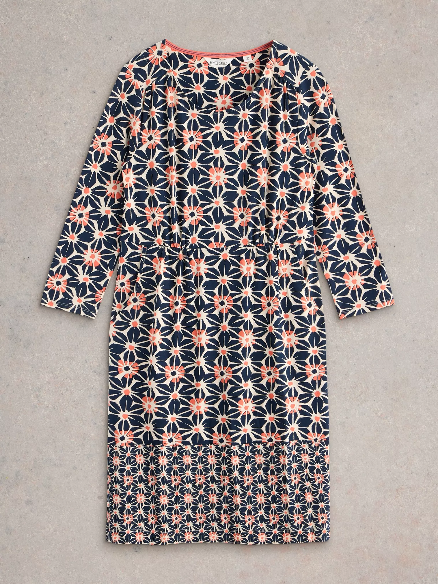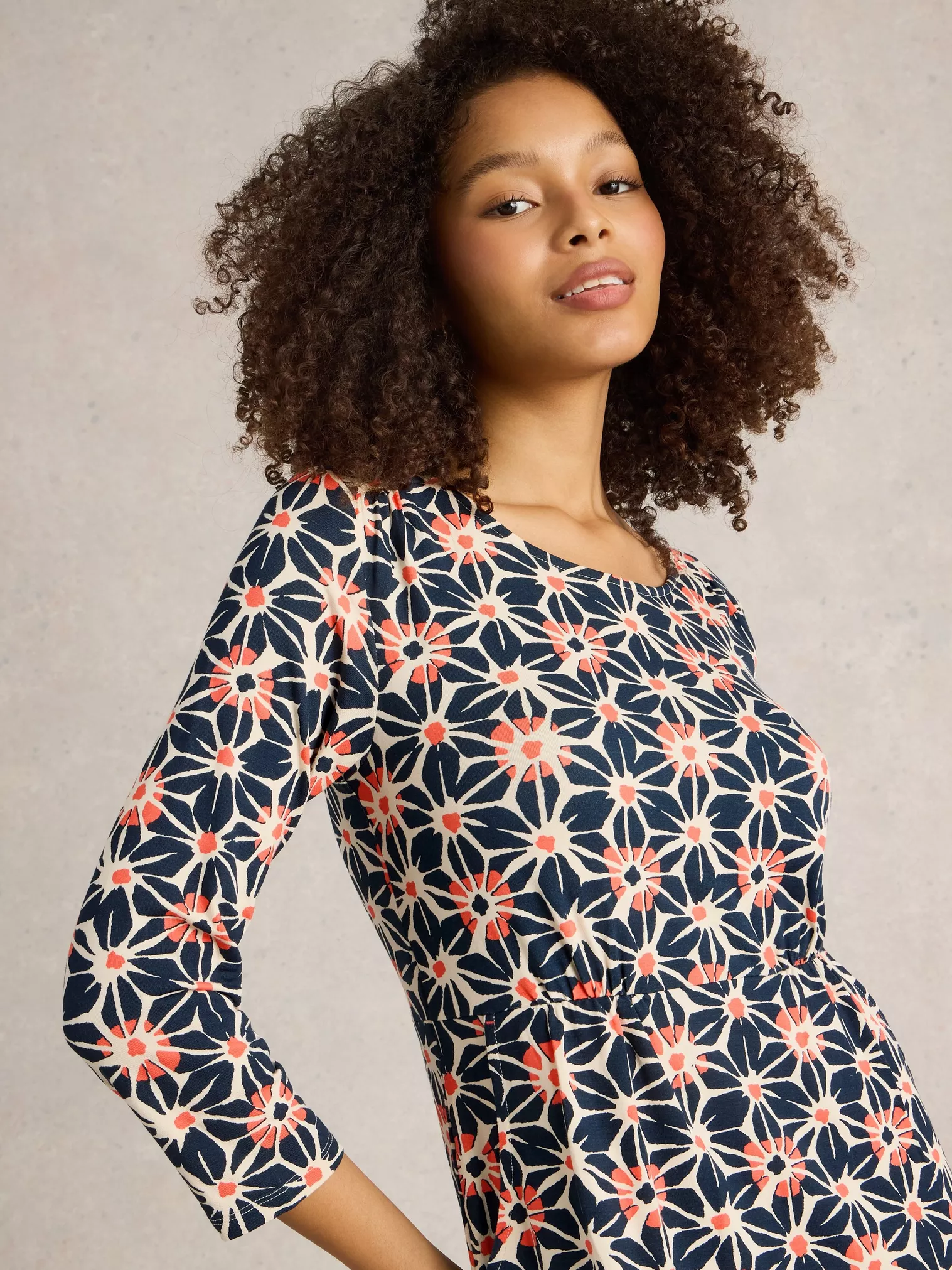 Cette robe à motif de fleurs géométriques marie harmonieusement douceur florale et modernité. Les lignes nettes et structurées donnent du caractère au motif tout en conservant une belle fluidité. Une pièce distinctive, facile à porter et visuellement forte.
