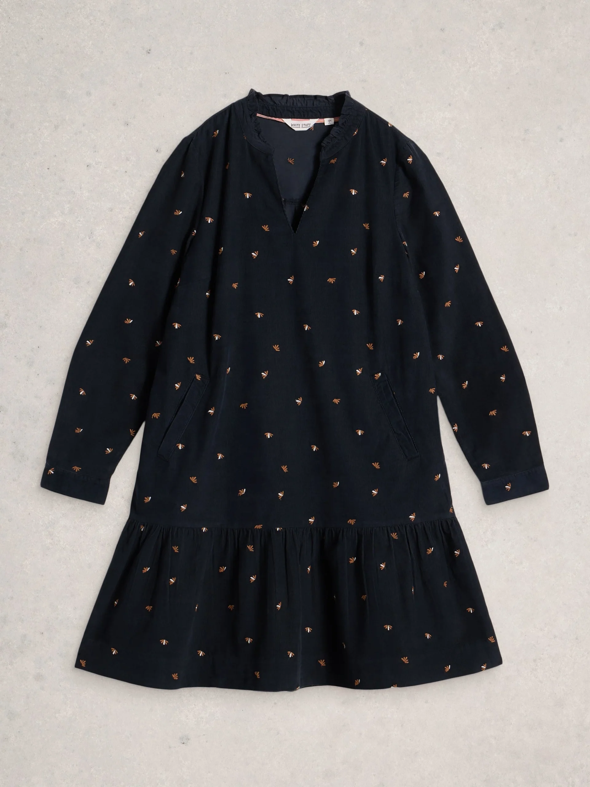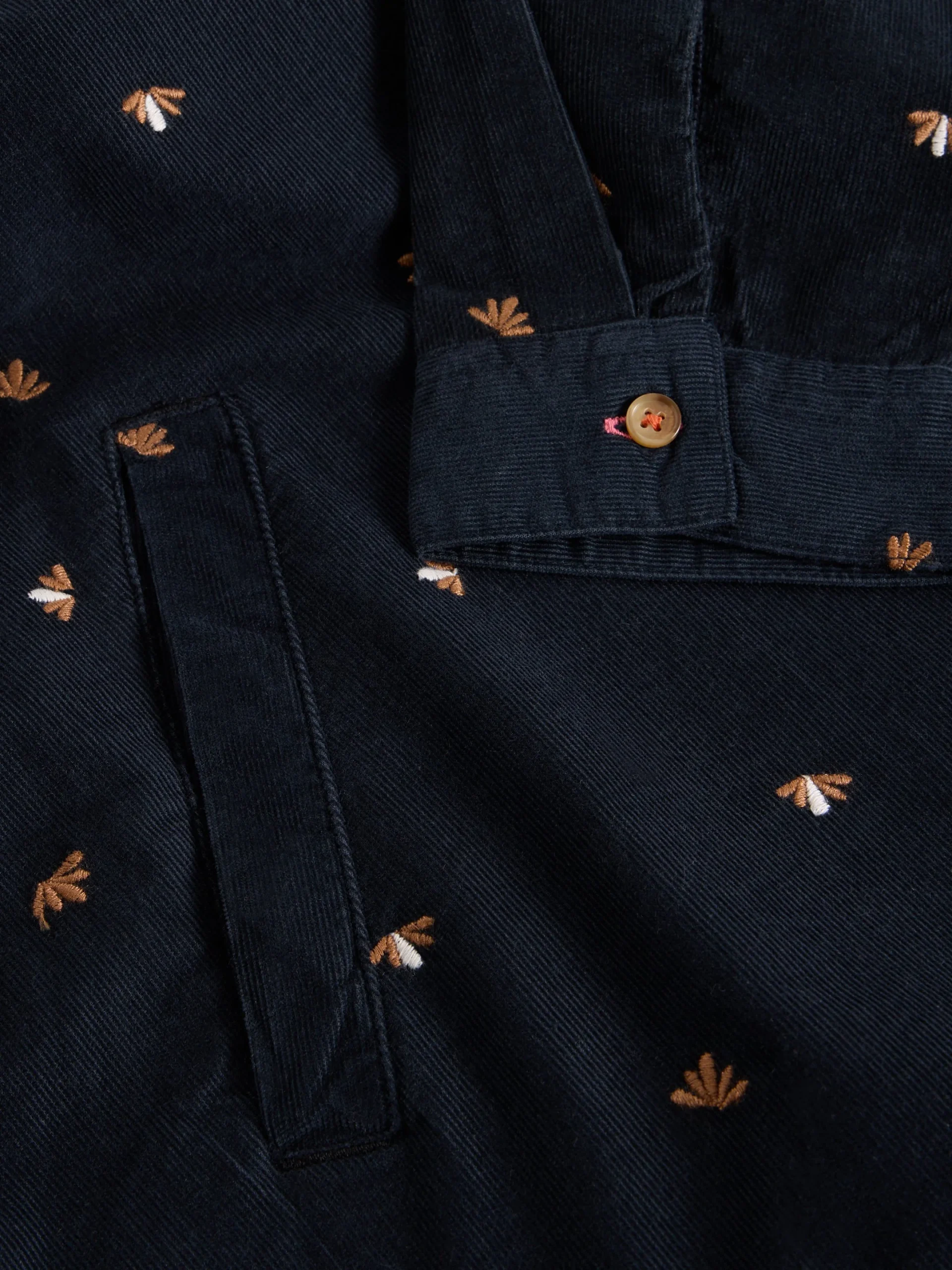Confectionnée en velours 100 % coton biologique, elle séduit par ses détails brodés discrets et sa jupe à étages qui apporte du mouvement. Son encolure fendue et sa coupe classique en font une pièce facile à porter au quotidien — que ce soit pour vos trajets en ville ou une escapade au jardin. Une robe confortable avec juste ce qu’il faut de caractère.