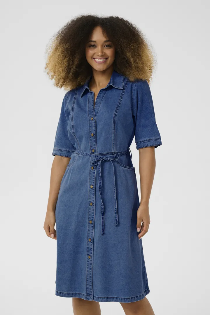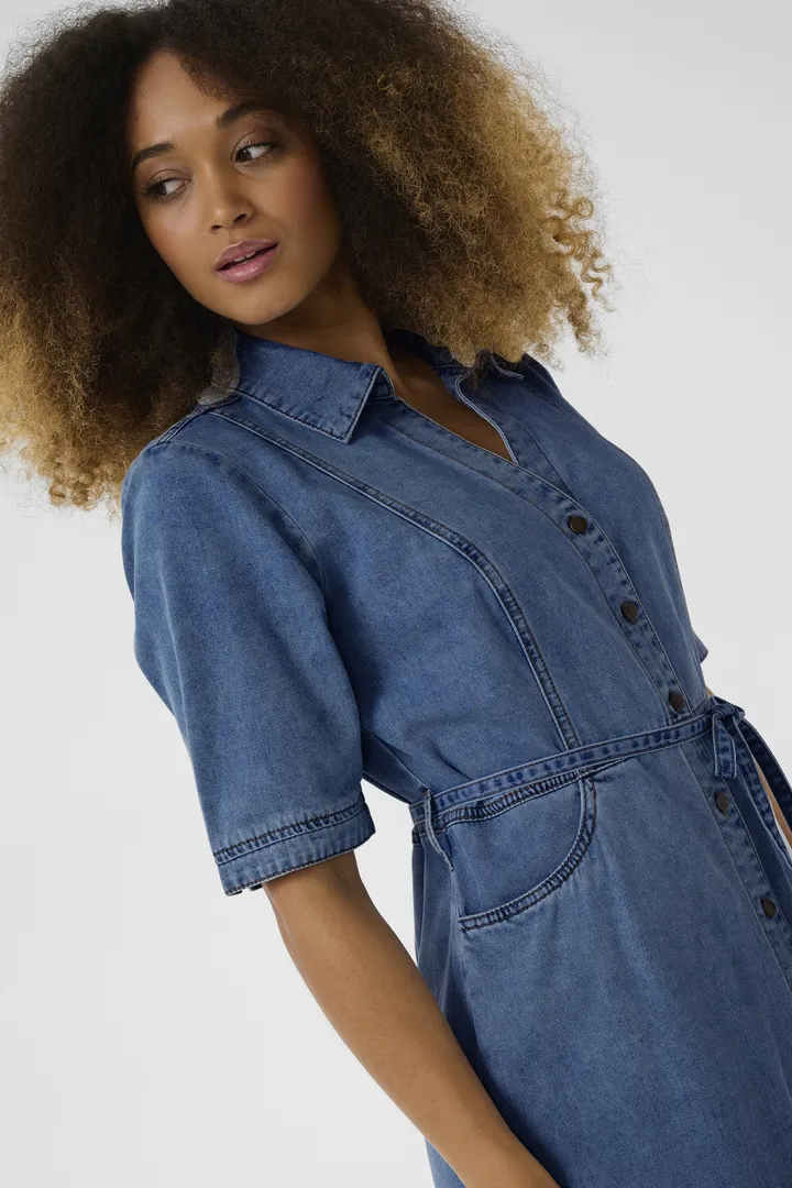Voici la robe qui fait dialoguer le charme de l’artisanat et la grâce de la féminité moderne. Taillée dans un denim doux mais structuré, cette pièce puise son inspiration dans l’univers du tablier de travail, mais en réinvente chaque ligne pour épouser et sublimer la silhouette. Ses coutures de style tablier, apparentes et franches, dessinent le corps avec précision tout en ajoutant une touche utilitaire-chic irrésistible. Elles sculptent les courbes, allongent la ligne, et donnent du caractère à une robe qui ne manque déjà pas de personnalité.
