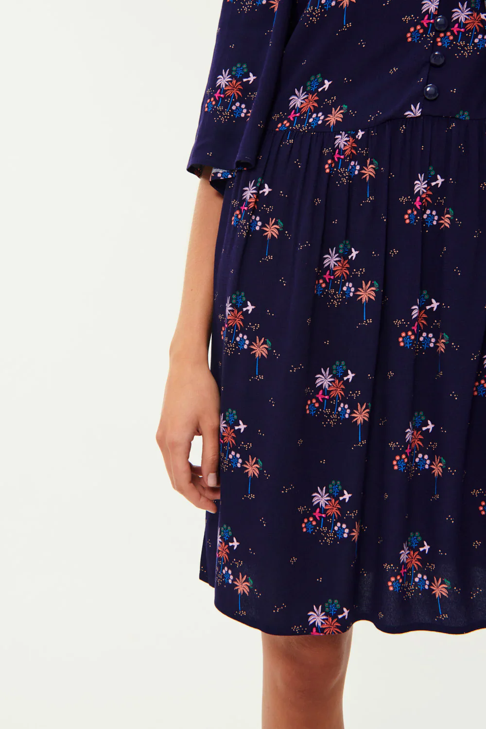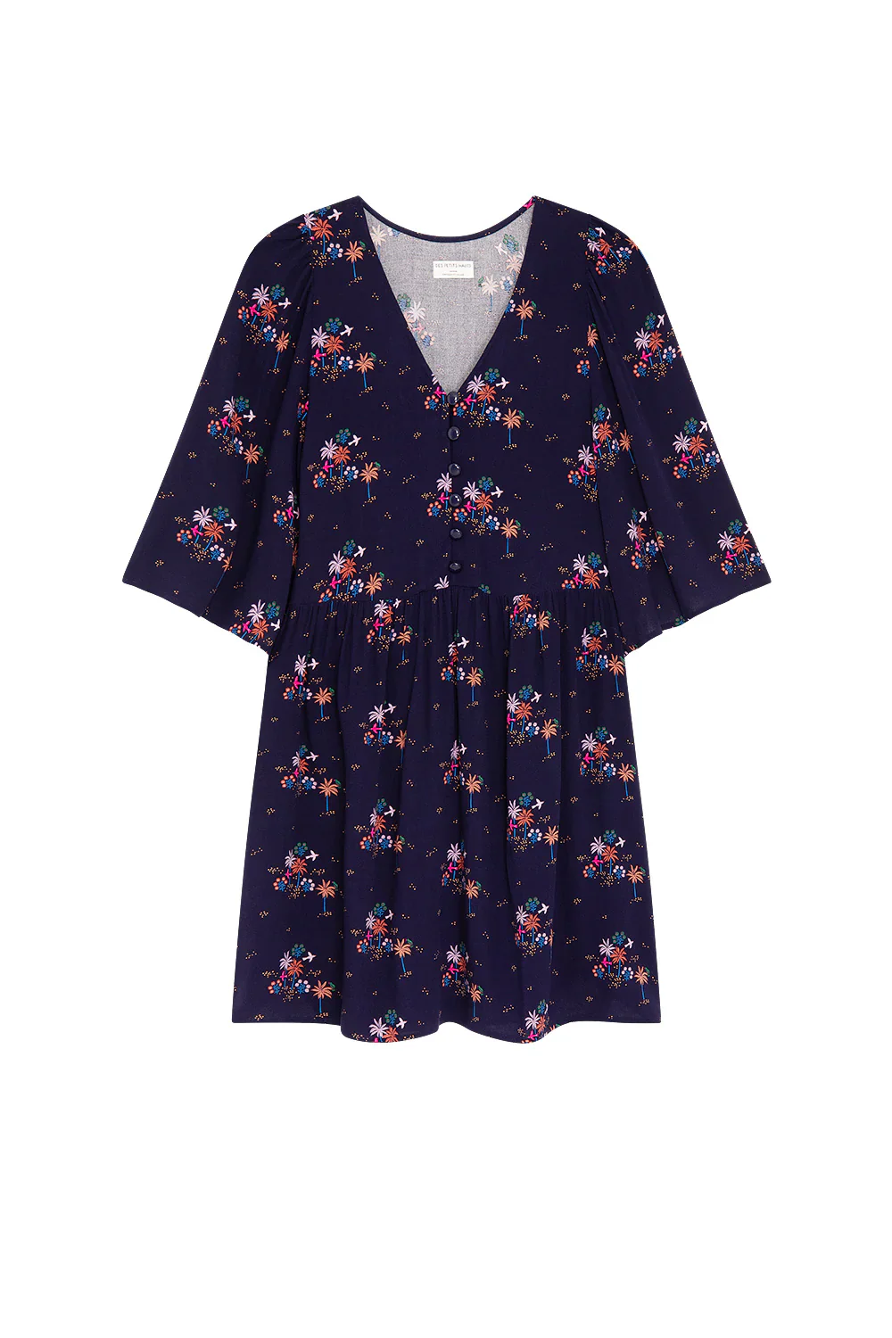 Le printemps arrive et avec lui les jolies robes courtes à l’élégante fluidité. En crêpe de viscose imprimée, manches papillon et découpe froncée à la taille structurent ce modèle à porter en ville ou sur le front de mer.