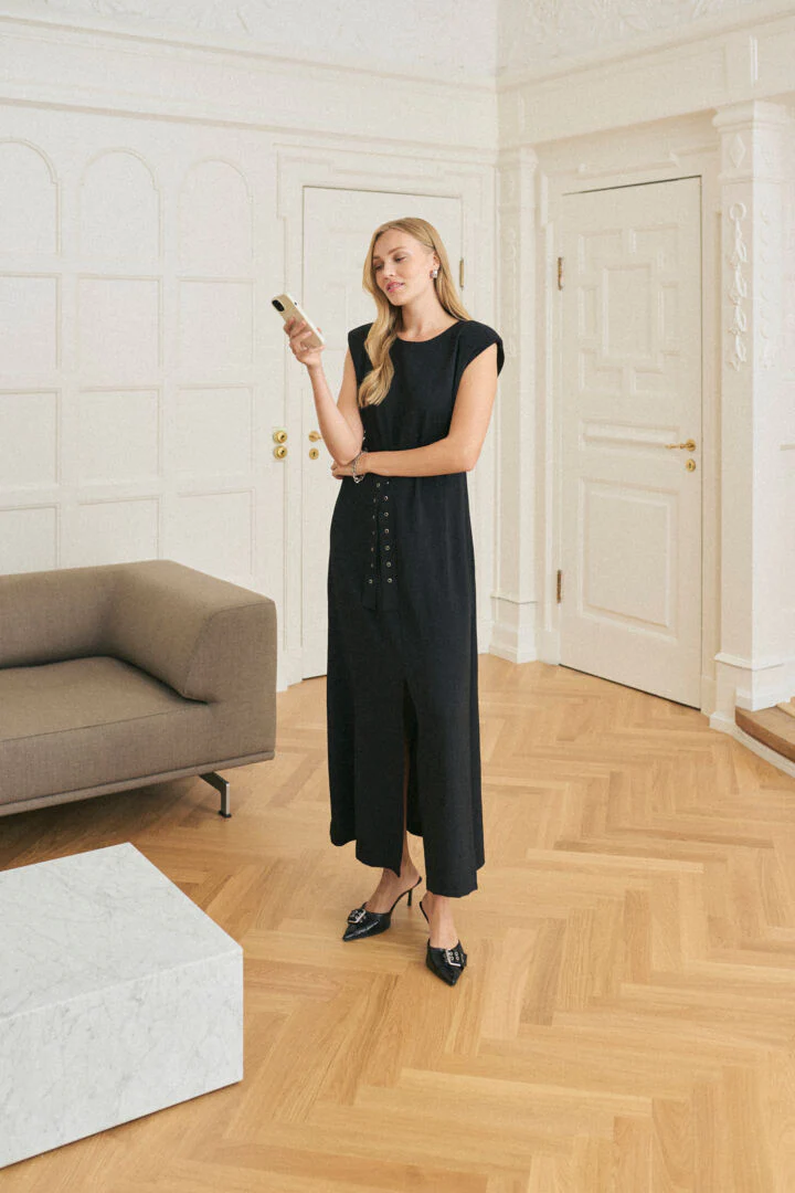 Cette robe maxi noire déploie sa silhouette longue et aérienne avec une fluidité envoûtante, parfaite pour capturer tous les regards. Mais ce qui lui donne ce supplément d’âme, c’est sa ceinture singulière, un clin d’œil direct aux années 2000, époque iconique du style audacieux. Les anneaux métalliques, autrefois symboles d’un esprit rebelle et décalé, sont ici repensés dans une version plus raffinée et contemporaine. Leur finition brillante et minimaliste sublime la taille sans jamais écraser la délicatesse du tissu noir profond. Résultat : un accessoire qui allie charme rétro et sophistication actuelle.