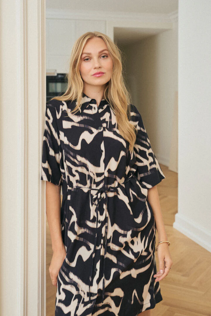 Un pas après l’autre, la lumière s’y glisse, le regard s’y attarde. Cette robe-chemise crème et noir, travaillée dans un tissu ajouré aux motifs en zigzag, joue avec les contrastes comme une énigme textile. Tantôt sage par sa coupe inspirée de la chemise classique, tantôt insaisissable par ses transparences géométriques qui dessinent la peau sans jamais la révéler tout à fait.