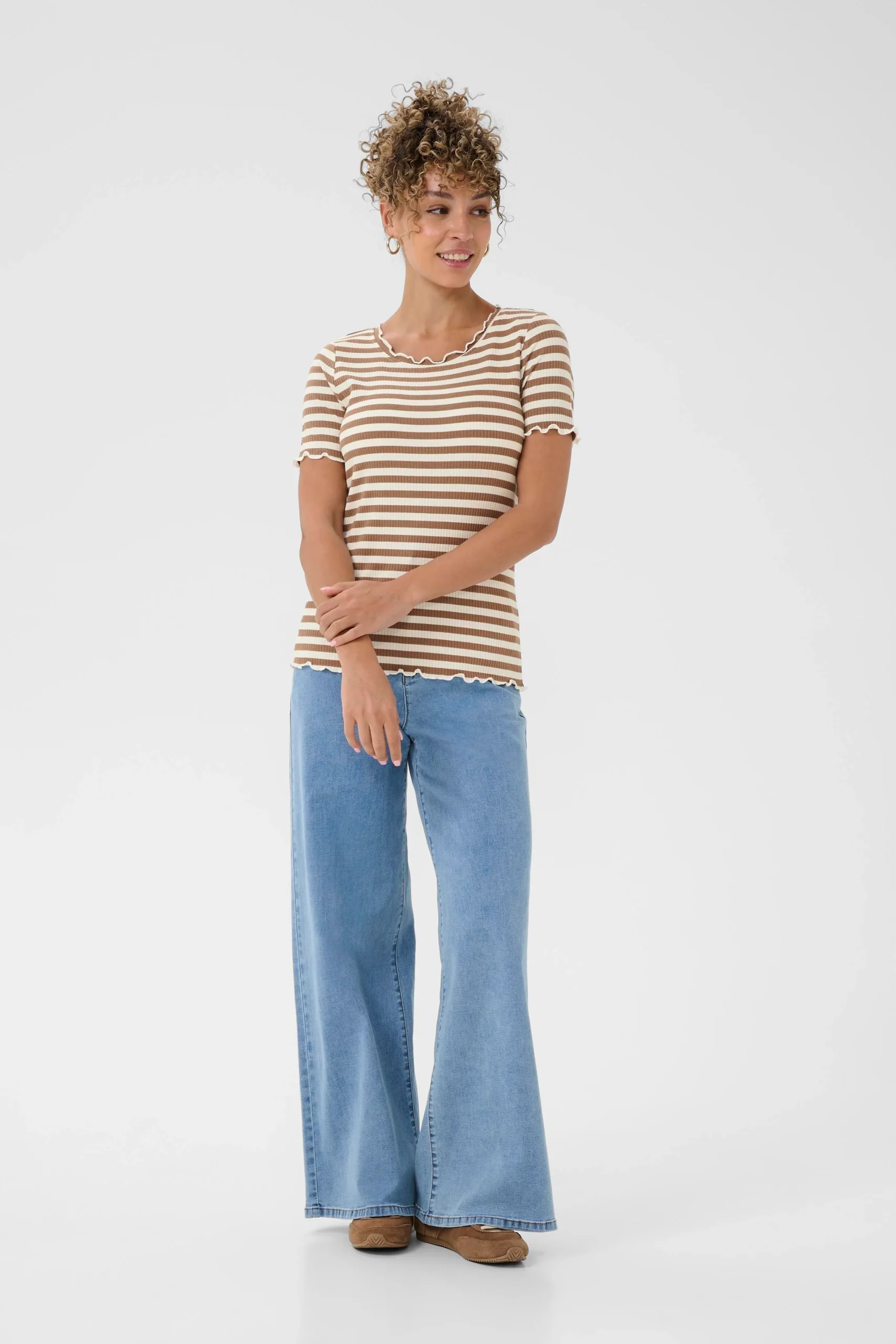 Ce t-shirt rayé revisite un essentiel avec une touche de féminité subtile. Sa matière douce et extensible épouse le corps sans contraindre, tandis que les finitions ondulées au col, aux manches et au bas ajoutent un détail délicat. Facile à porter au quotidien, il se glisse aussi bien sous un veston que porté seul.